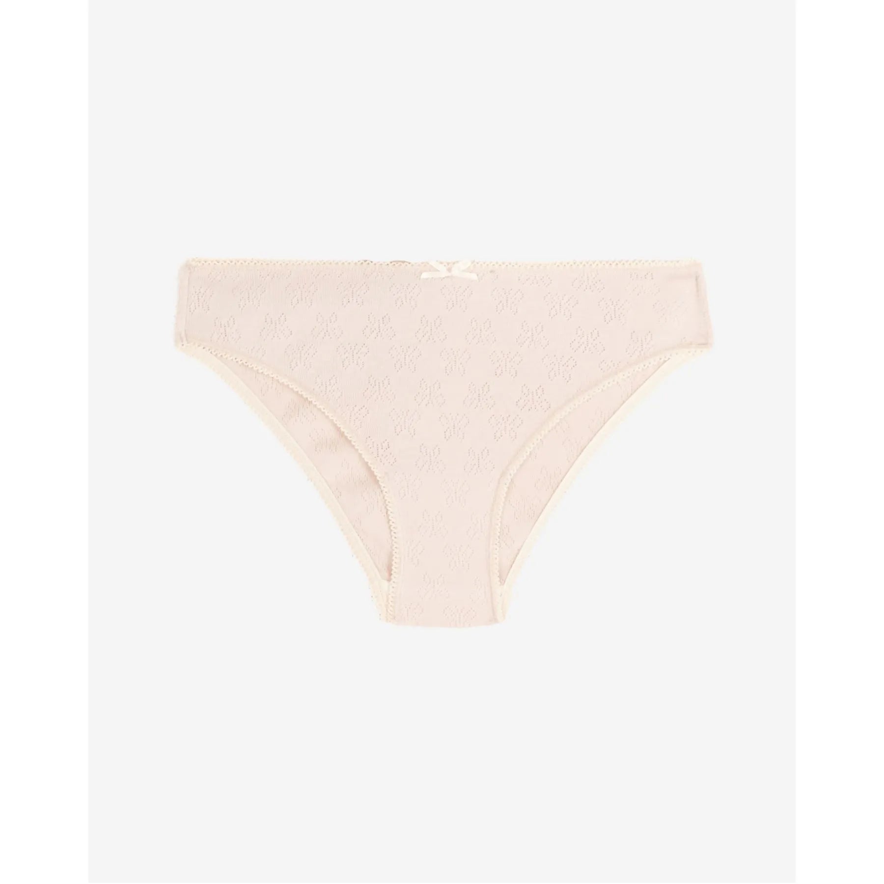 Nuevo patrón de braguita clásica confeccionada con algodón 100% orgánico. Su diseño, de lo más romántico, cuenta con lazo y ribetes decorativos y un tejido calado con mariposas.