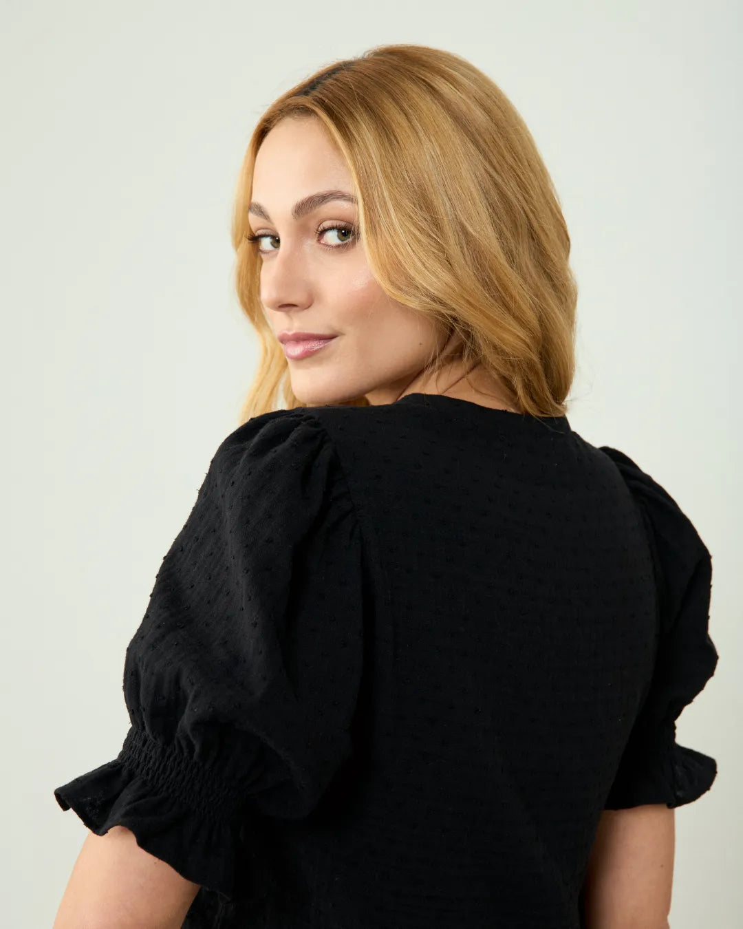 Blusa de manga corta abullonada en color negro, confeccionada en muselina plumeti de algodón 100% orgánico, en un taller familiar de Madrid.