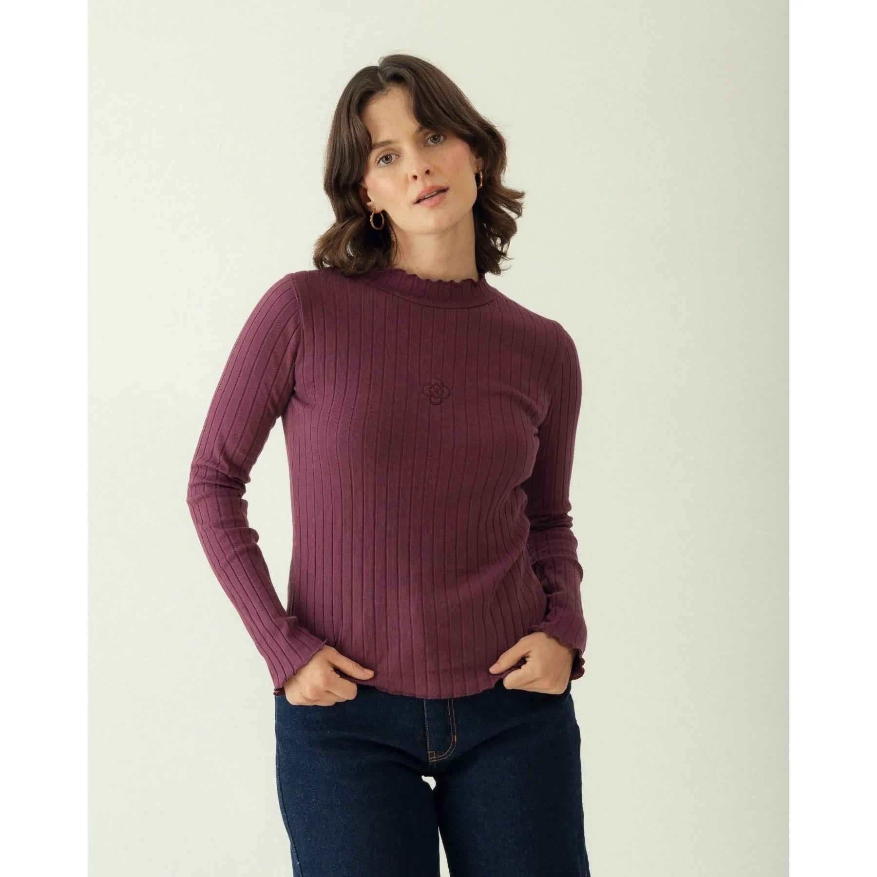 Top de canalé con detalle ondulado en cuello, mangas y bajo. Un básico renovado con un detalle muy especial para elevar tus looks más casuales. Confeccionado con algodón 100% orgánico en un taller familiar de Portugal.