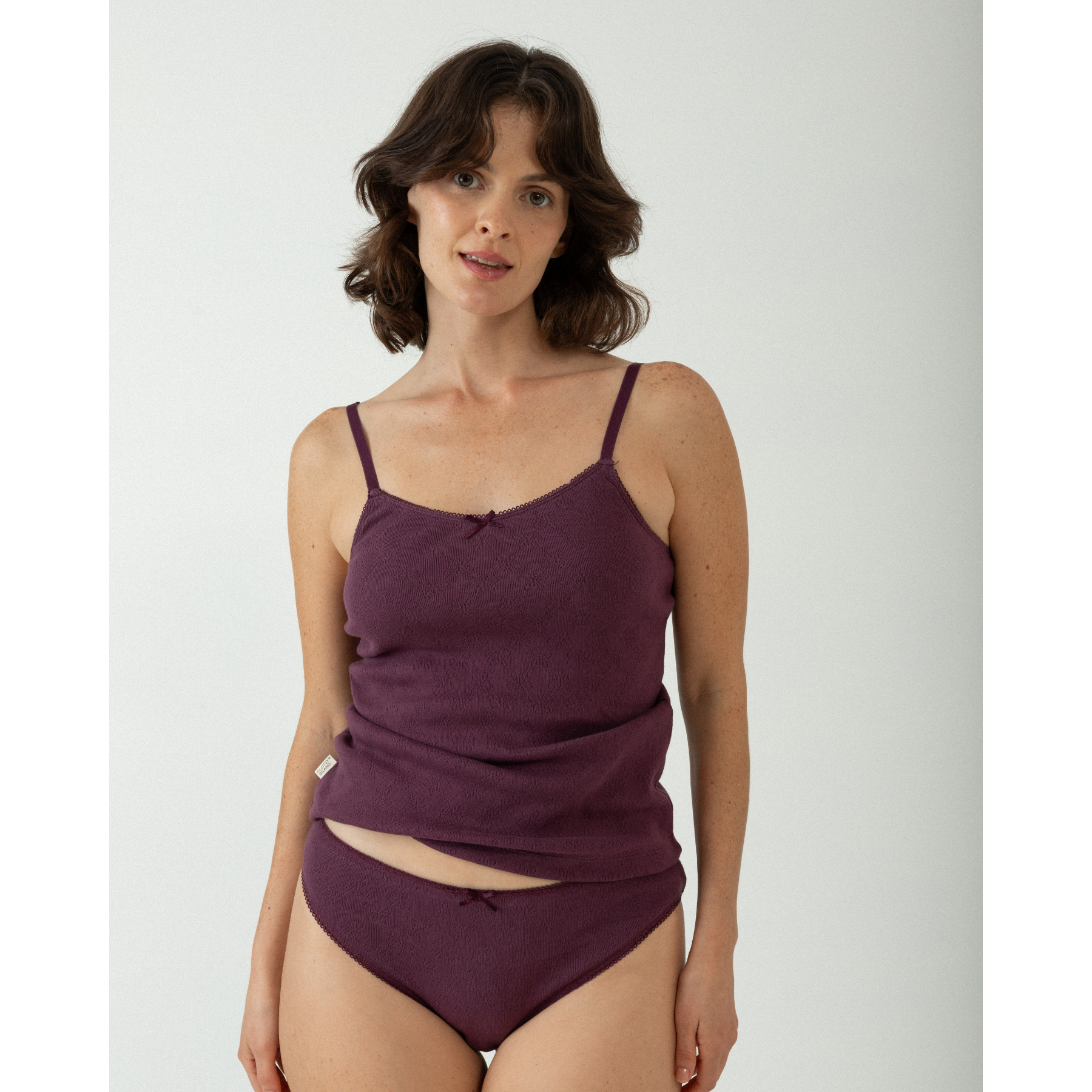 Nuevo patrón de braguita clásica confeccionada con algodón 100% orgánico. Su diseño, de lo más romántico, cuenta con lazo y ribetes decorativos y un tejido calado con mariposas.