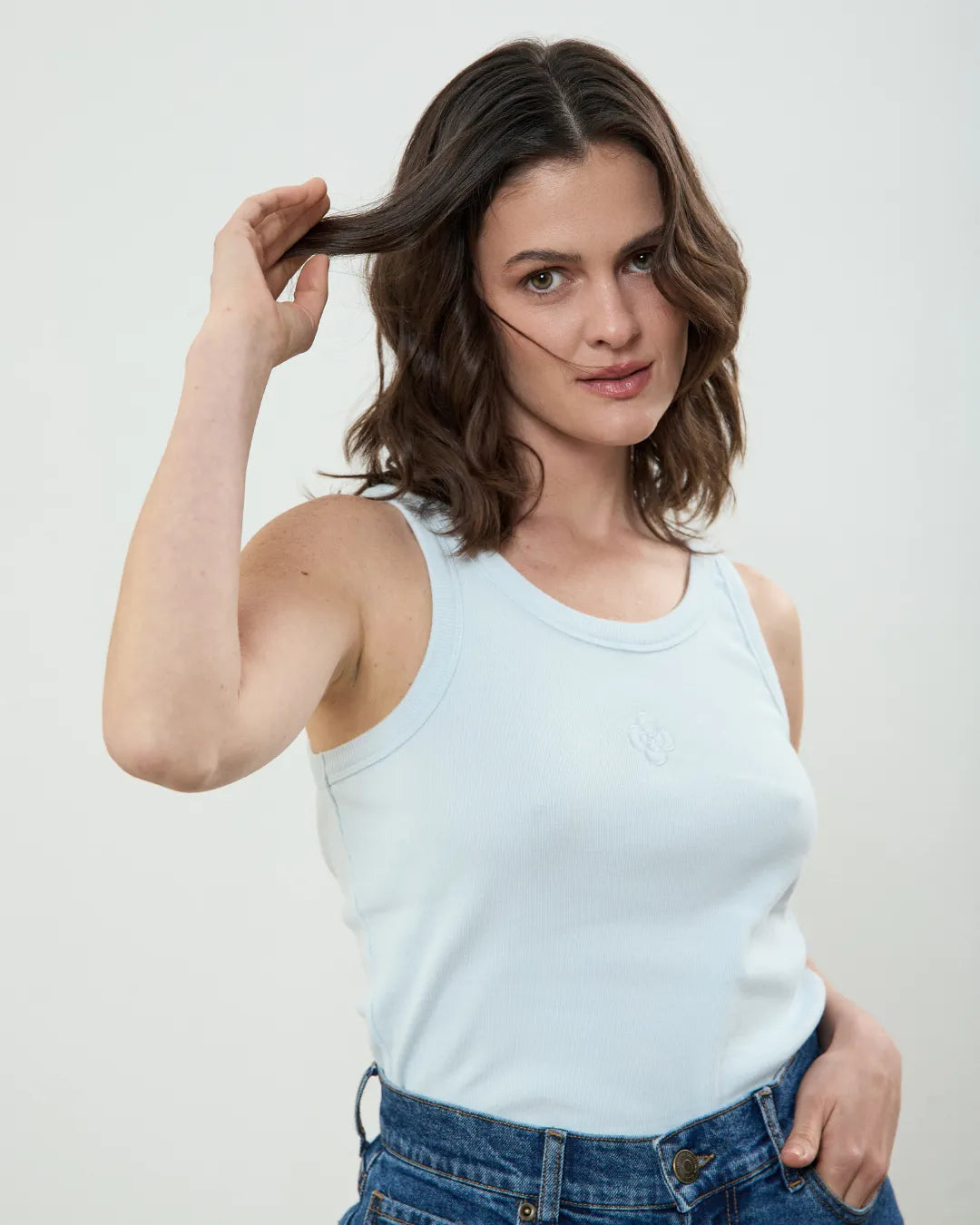 Nuevo tank top de algodón orgánico en color azul, ajustado al cuerpo y con cuello redondo. Con un tejido de canalé súper fresquito y de tacto gustoso, transpirable y perfecto para el verano. Incluye un bordado del icono flor decorativo al tono.