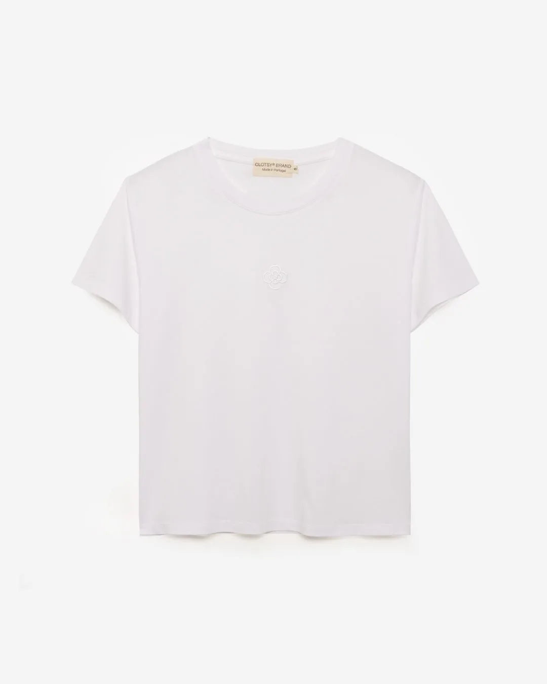 Einfaches, kurzärmeliges T-Shirt in Weiß mit aufgesticktem Logo auf der Brust.