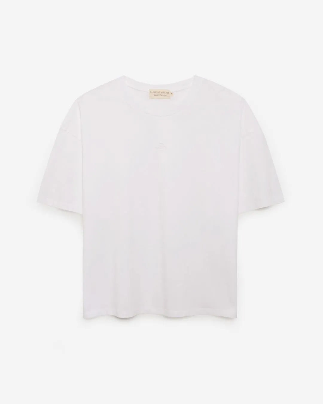 Camiseta de manga corta blanca de algodón 100% orgánico con la flor de Clotsy bordada. Cómoda, fresquita y súper suave al tacto. Confeccionada en Portugal.