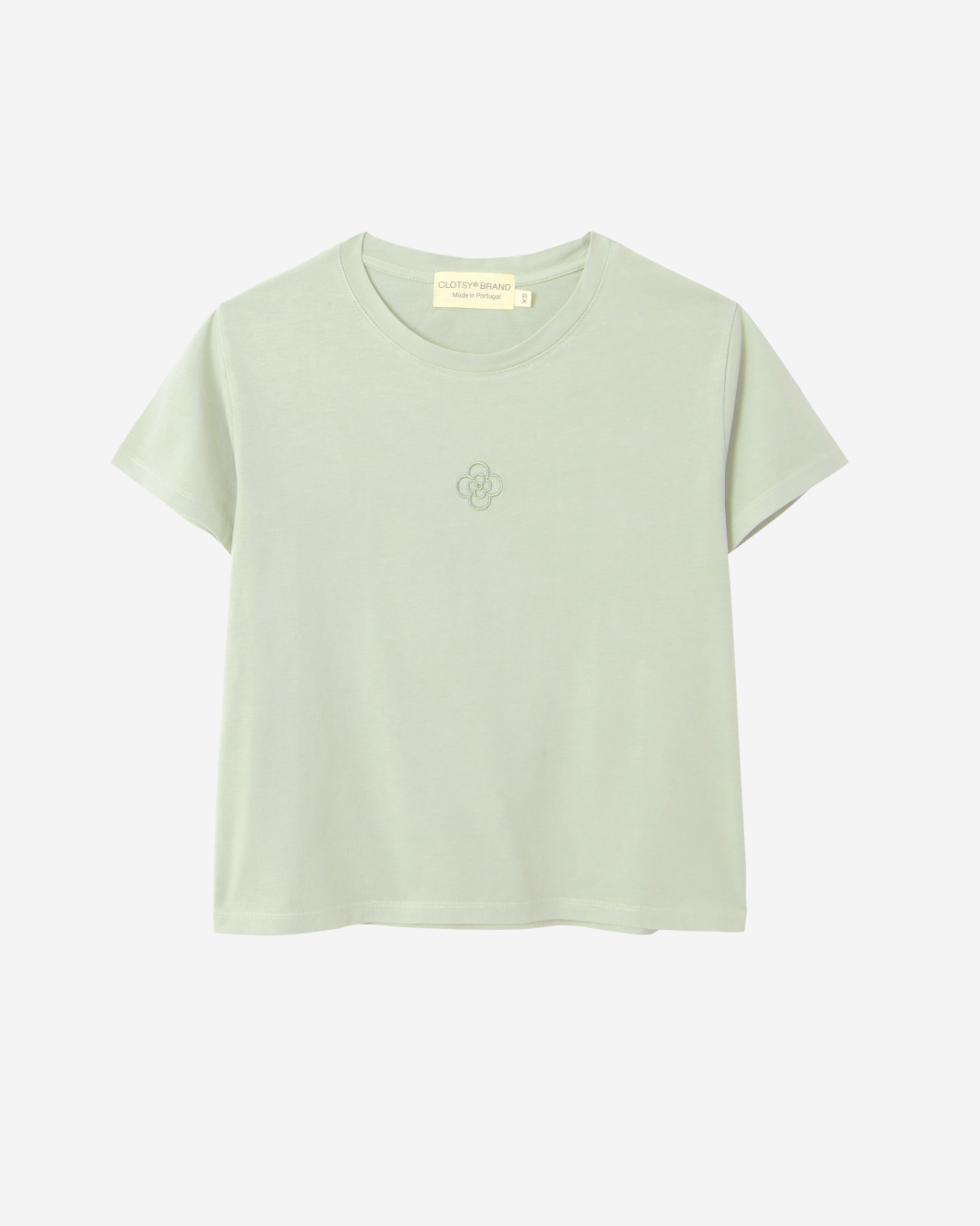 Camiseta de manga corta verde de algodón 100% orgánico con la flor de Clotsy bordada. Cómoda, fresquita y súper suave al tacto. Confeccionada en Portugal.