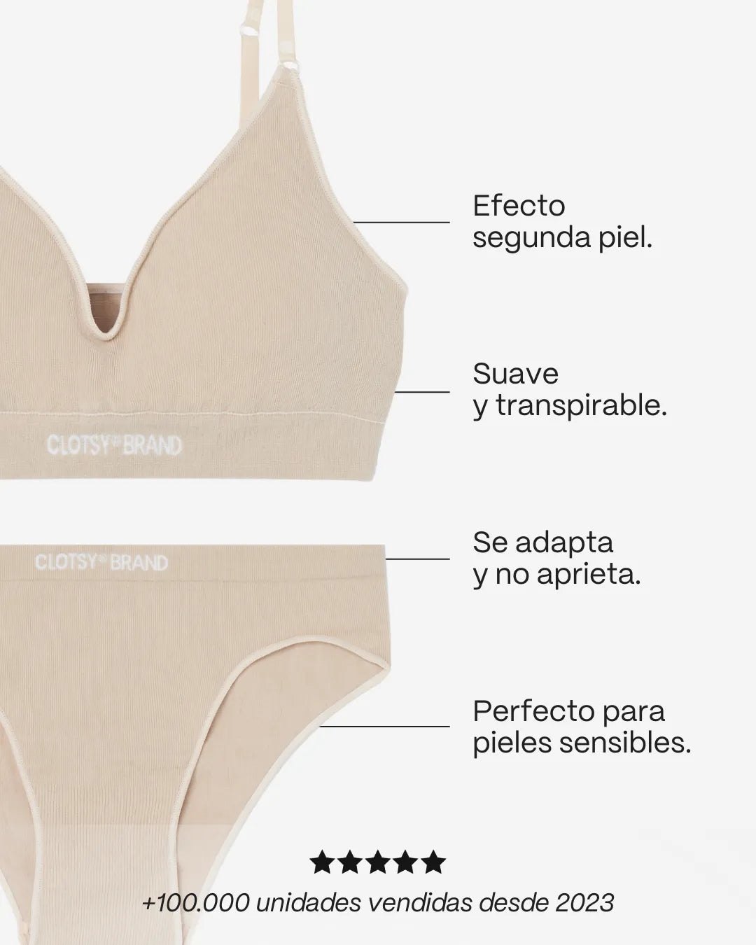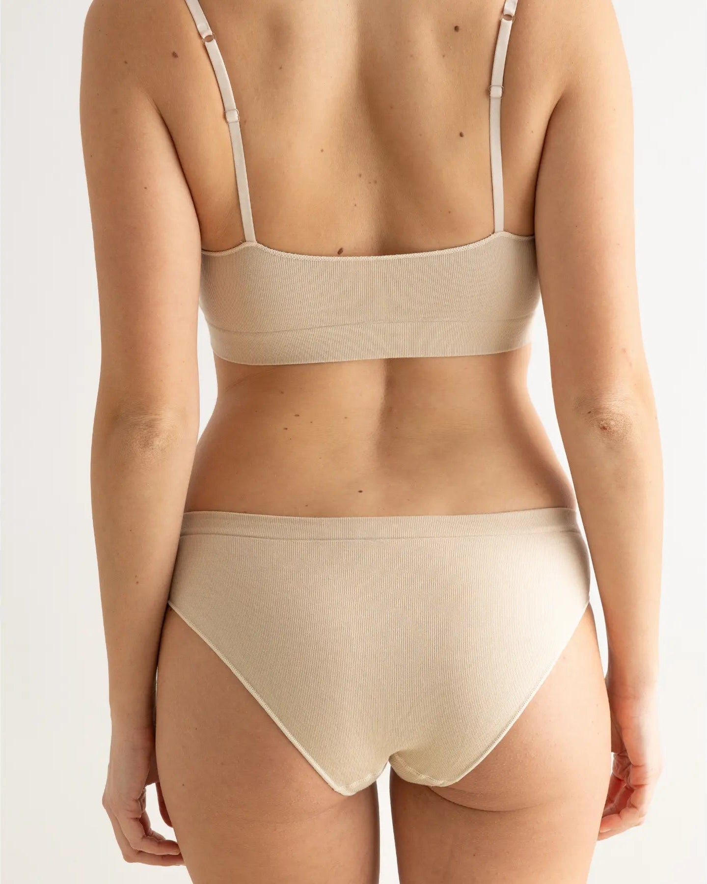 Conjunto de bralette y braga clásica en tono arena, sin costuras y con efecto segunda piel. Está confeccionado en un tejido de canalé super suave que te proporciona comodidad, elasticidad y transpirabilidad. ¡Sentirás que no llevas nada!