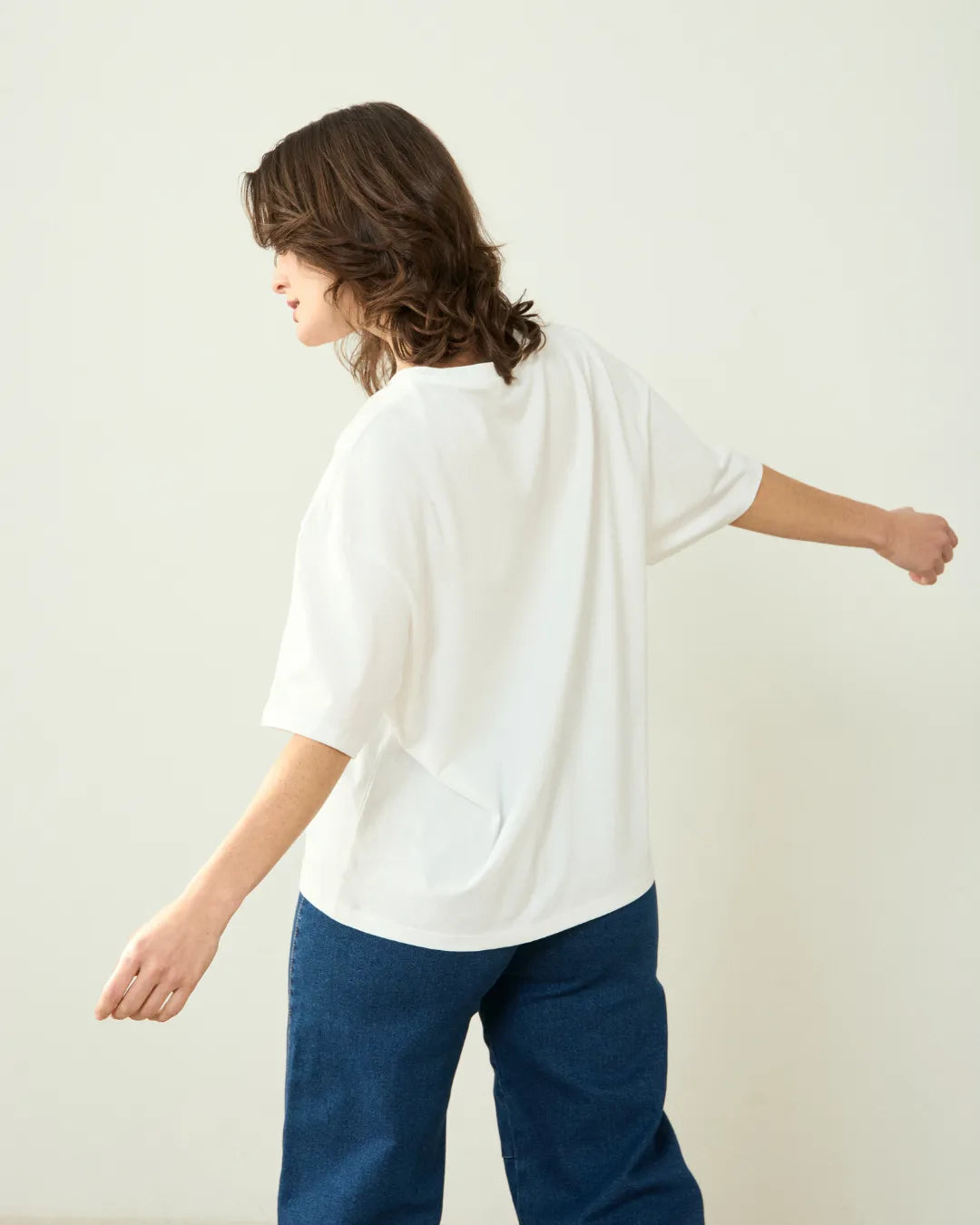 Camiseta de manga corta blanca de algodón 100% orgánico con la flor de Clotsy bordada. Cómoda, fresquita y súper suave al tacto. Confeccionada en Portugal.