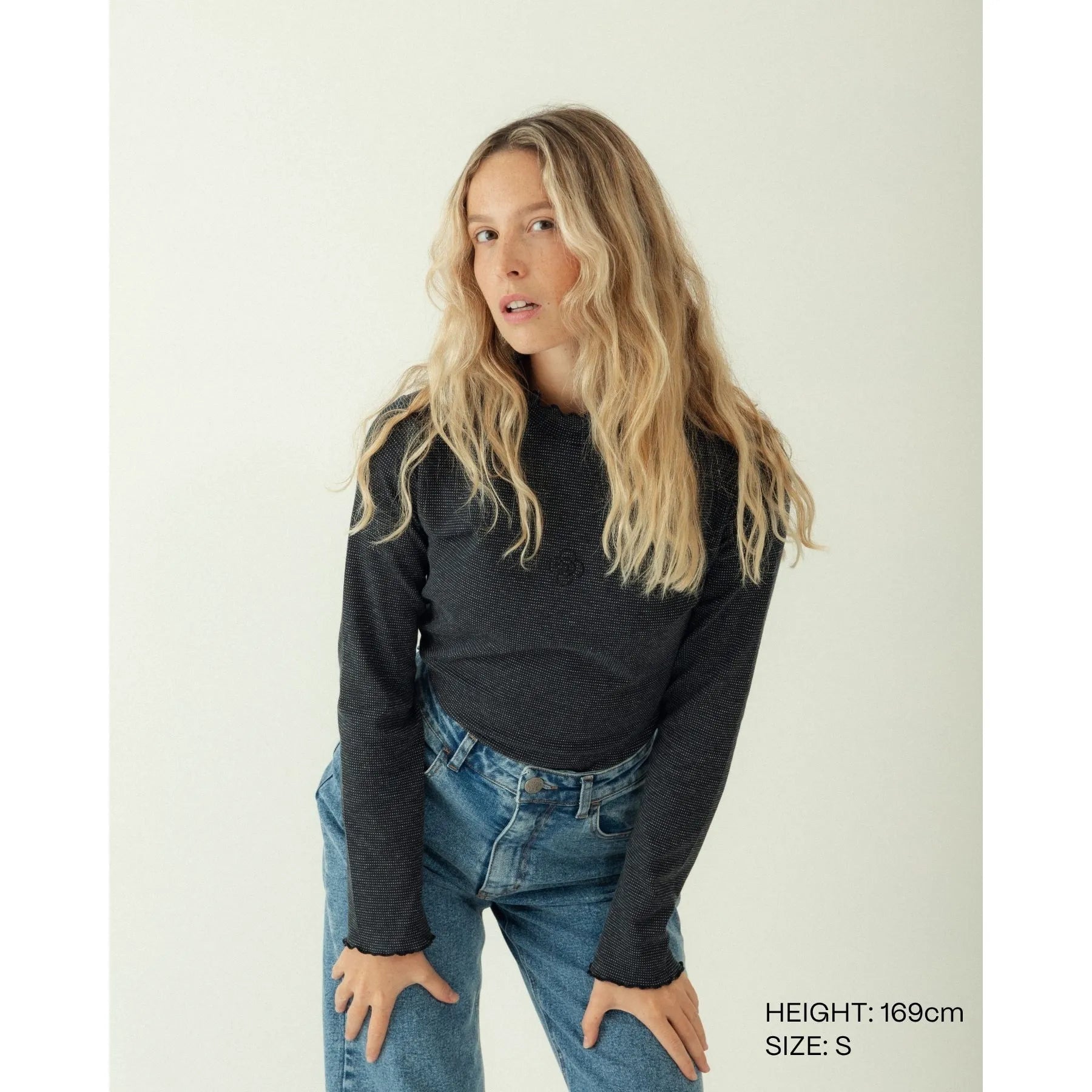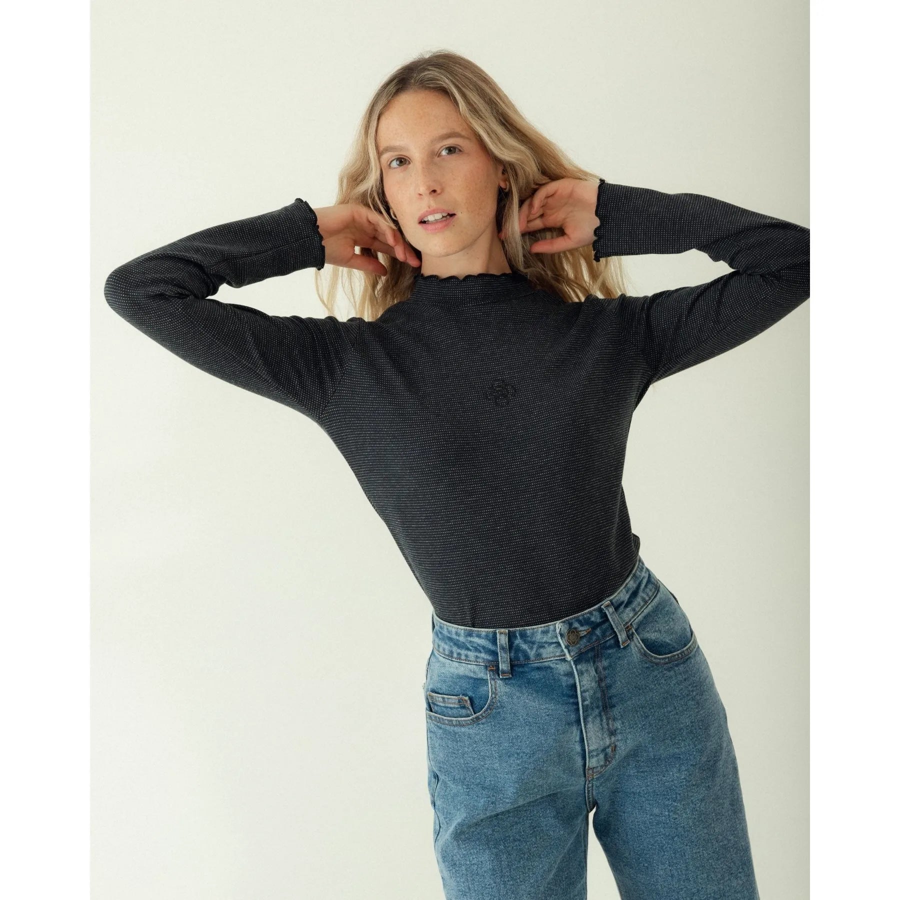 Top de canalé con detalle ondulado en cuello, mangas y bajo. Un básico renovado con un detalle muy especial para elevar tus looks más casuales. Confeccionado en tejido jacquard de algodón orgánico y poliéster reciclado en un taller familiar de Portugal.