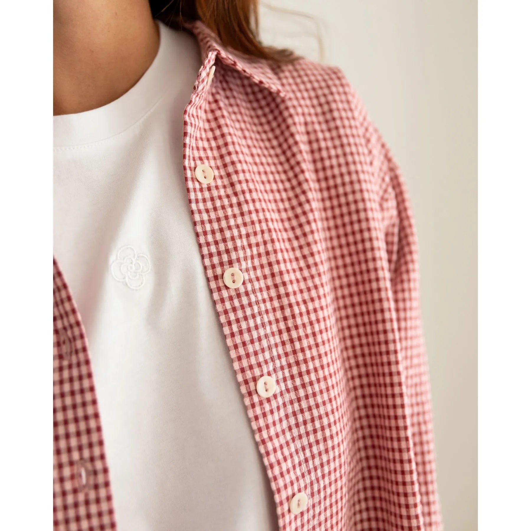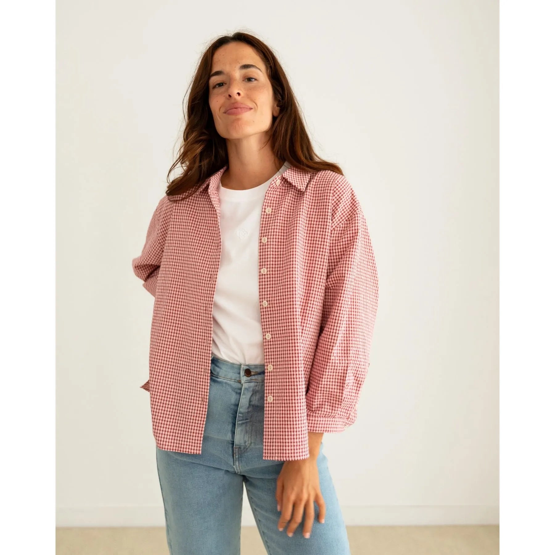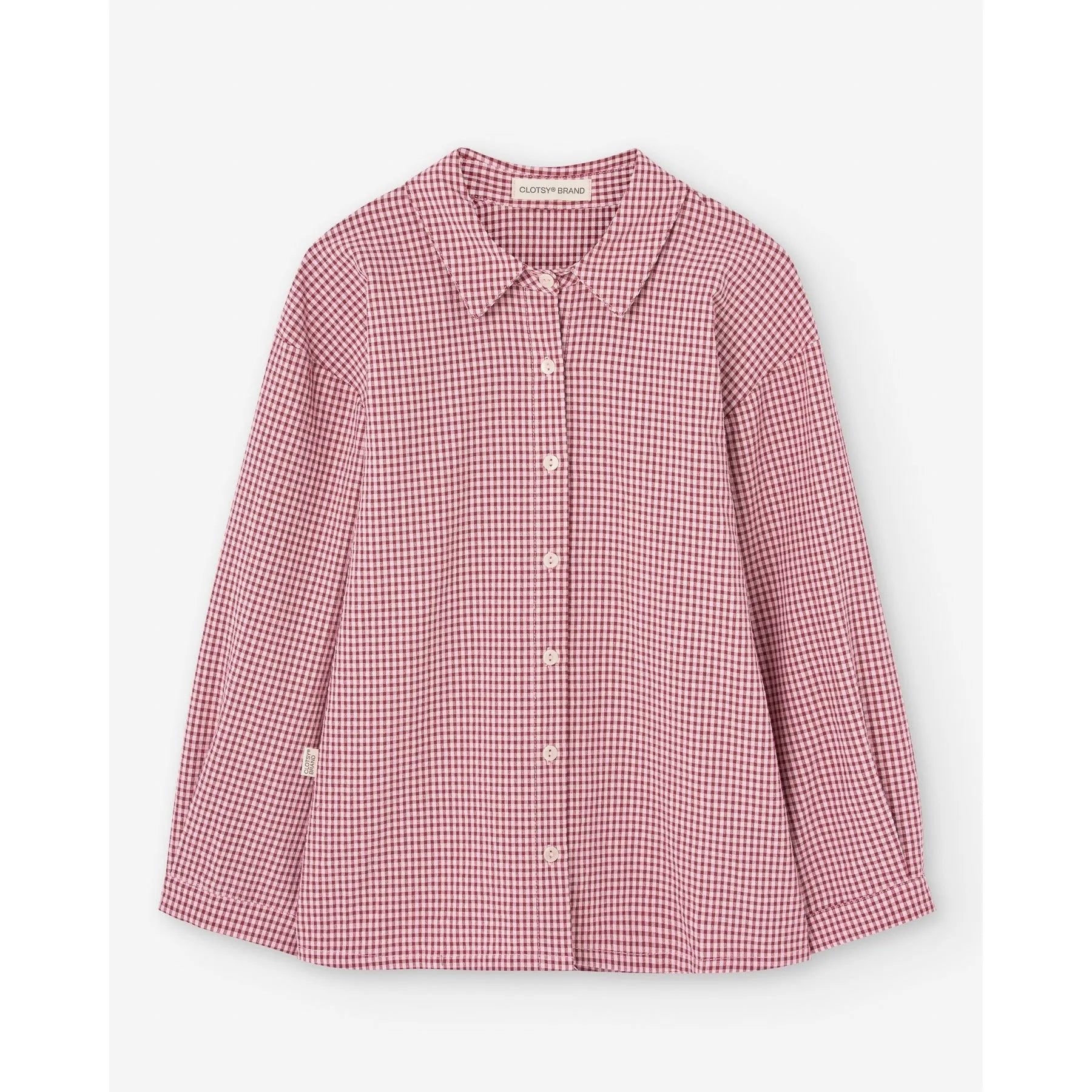 One of the most versatile and unique shirts in the collection. Its burgundy plaid print gives it a timeless and romantic look, perfect for pairing with jeans or wearing as a total look with burgundy gingham pants.