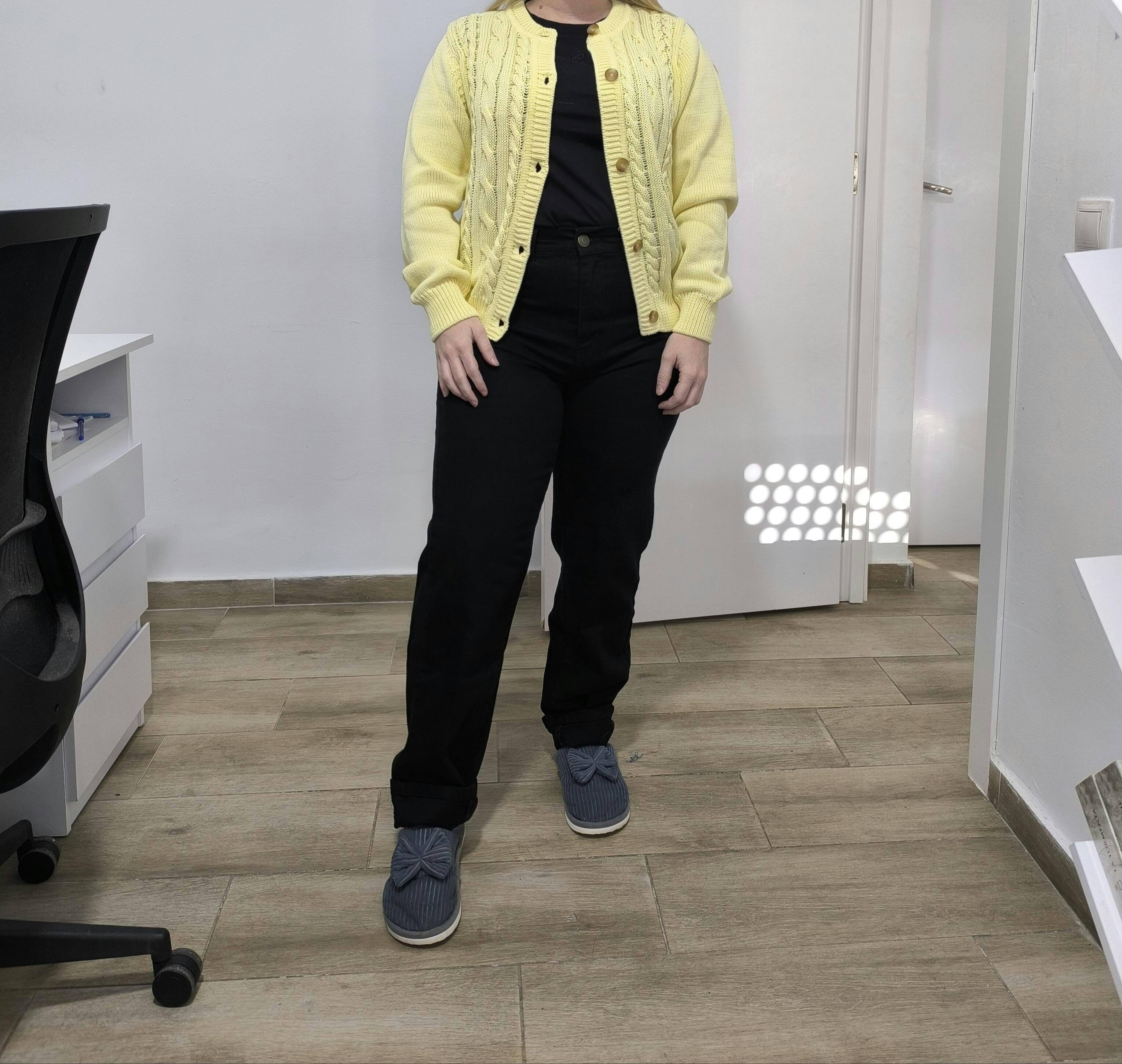 Cárdigan de punto confeccionado con algodón 100% orgánico en un taller familiar de Cuenca. Con ochos decorativos en la parte delantera y punto liso en mangas y espalda. Sus botones, hechos de corozo, potencian aún más el estilo Cottagecore del cárdigan. ¡Pura artesanía!