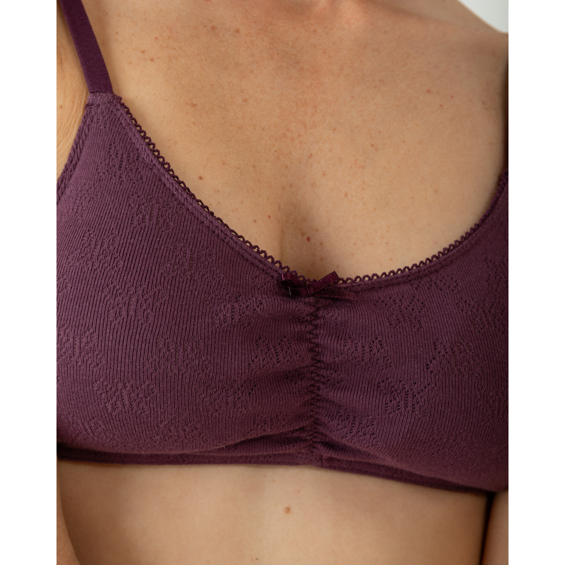 Nuevo patrón de bralette confeccionado con algodón 100% orgánico. Su diseño, de lo más romántico, cuenta con lazo y ribetes decorativos y un tejido calado con mariposas.