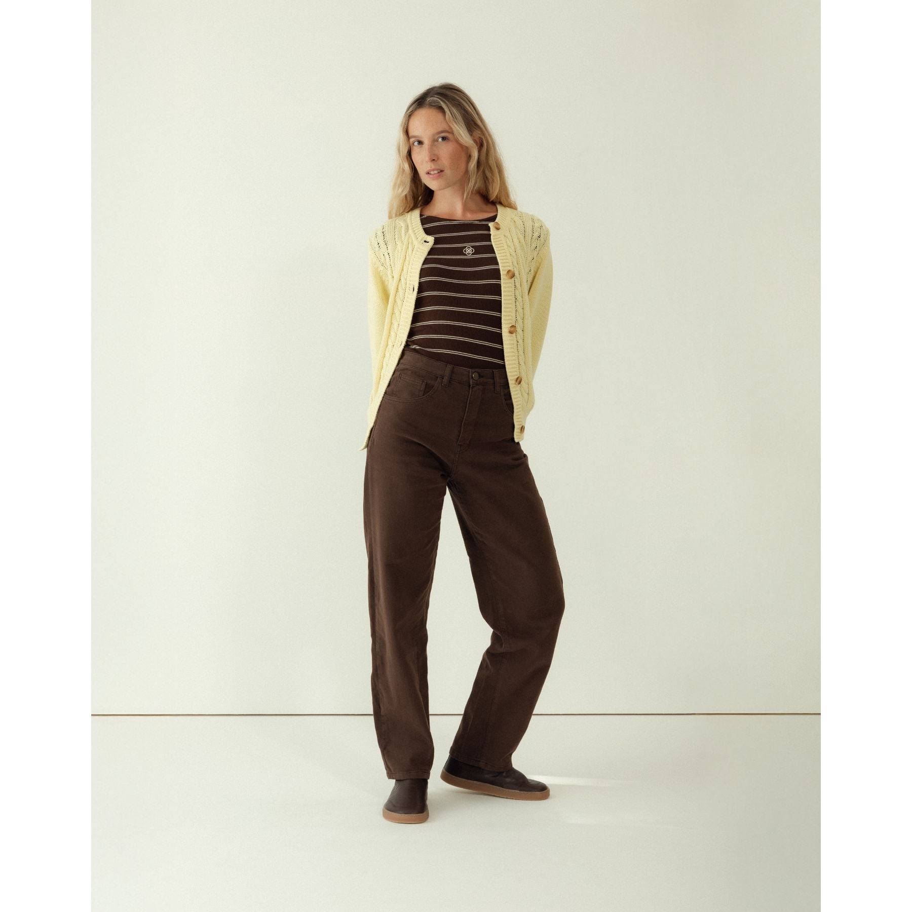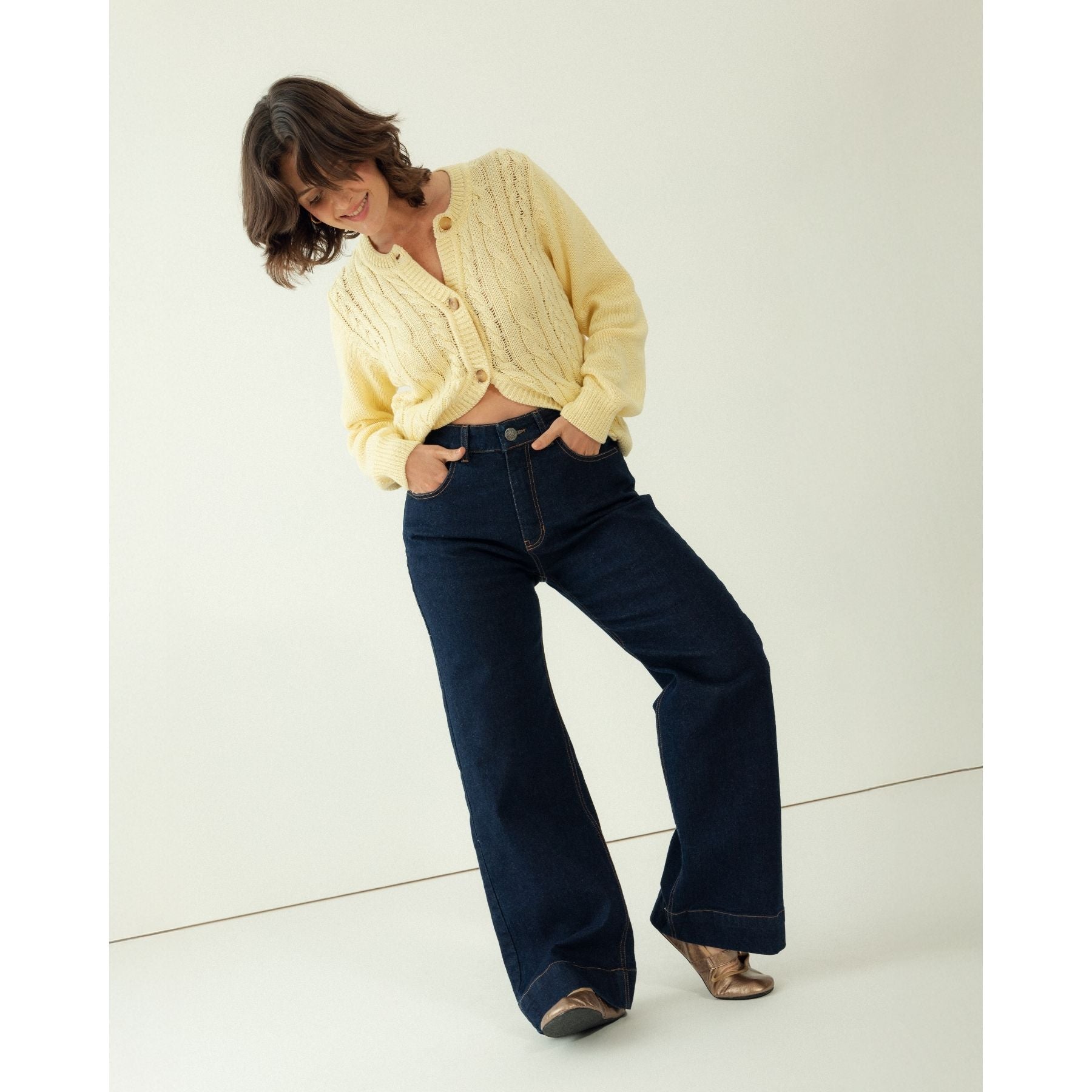 Cárdigan de punto confeccionado con algodón 100% orgánico en un taller familiar de Cuenca. Con ochos decorativos en la parte delantera y punto liso en mangas y espalda. Sus botones, hechos de corozo, potencian aún más el estilo Cottagecore del cárdigan. ¡Pura artesanía!