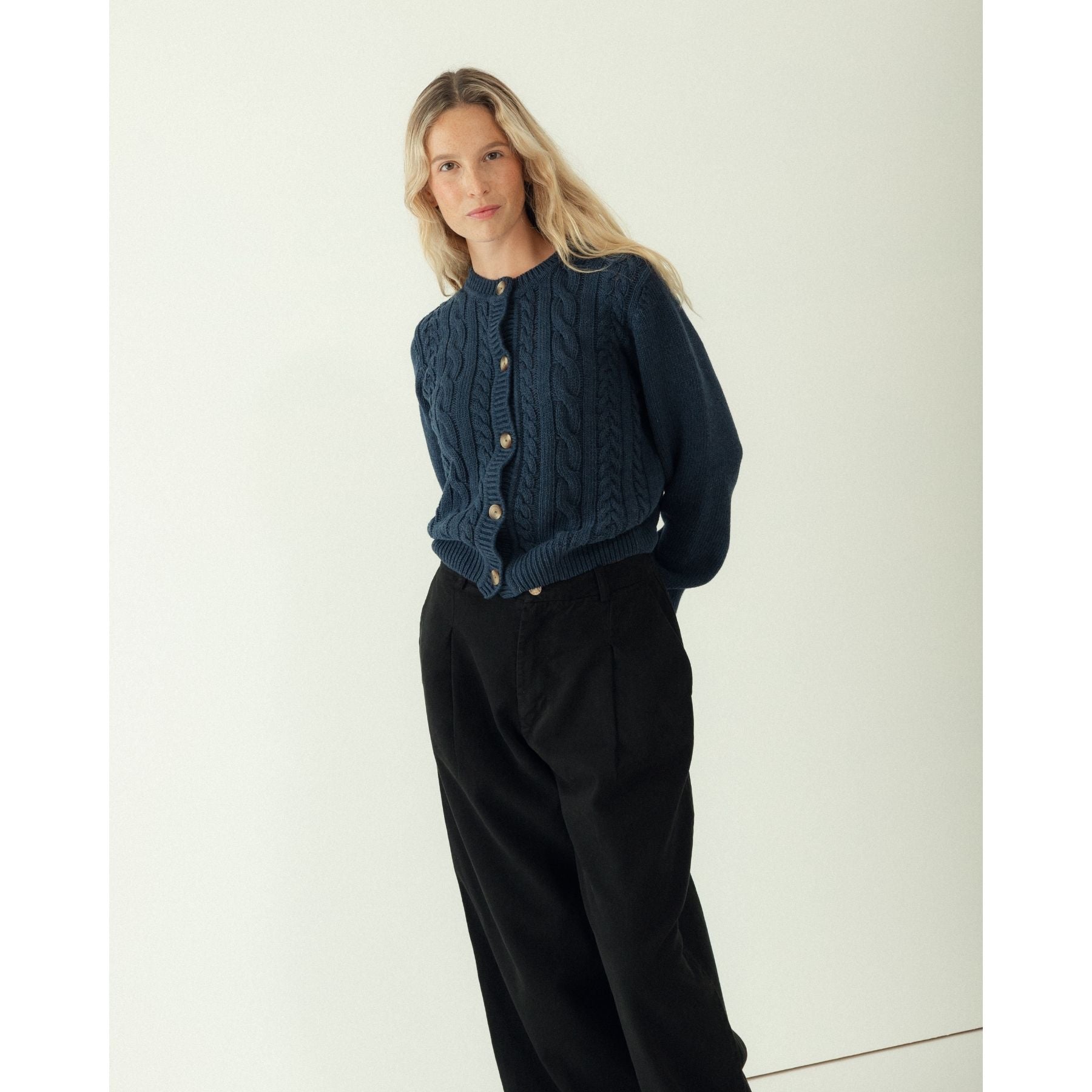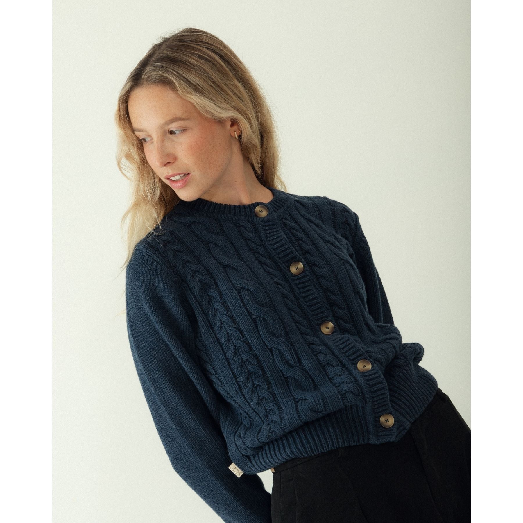 Cárdigan de punto confeccionado con algodón 100% orgánico en un taller familiar de Cuenca. Con ochos decorativos en la parte delantera y punto liso en mangas y espalda. Sus botones, hechos de corozo, potencian aún más el estilo Cottagecore del cárdigan. ¡Pura artesanía!